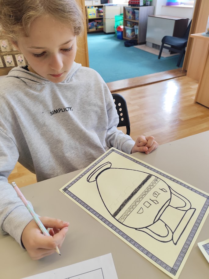 Nejprve jsme se seznámili s typickými vzory a tvary, které staří Egypťané používali, a poté jsme se pustili do vlastní tvorby. Děti pracovaly s voskovkami, pomocí kterých vytvářely barevné ornamenty a jednoduché symboly.