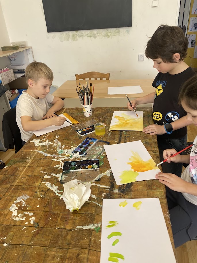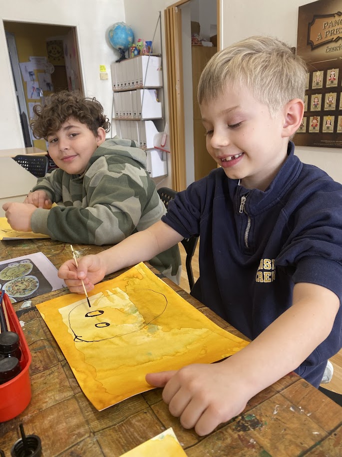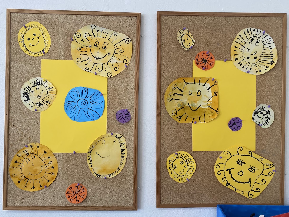 Pomocí anilinových barev jsme si namalovali základ pro naše sluníčka. Pomocí tuše a vlastní fantazie si každý domaloval sluneční paprsky. Jednoduché tvoření, které si děti užily.