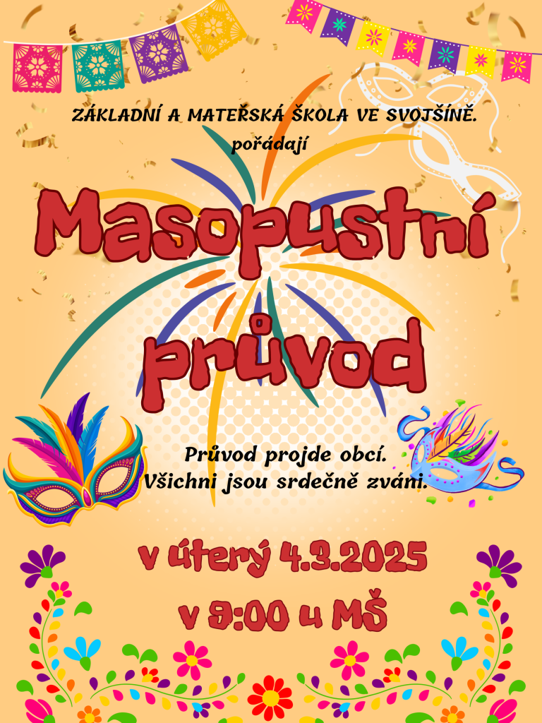 Masopustní průvod projde obcí v úterý 4.3.2025. Děti základní a mateřské školy vyjdou v 9:00 od budovy MŠ.